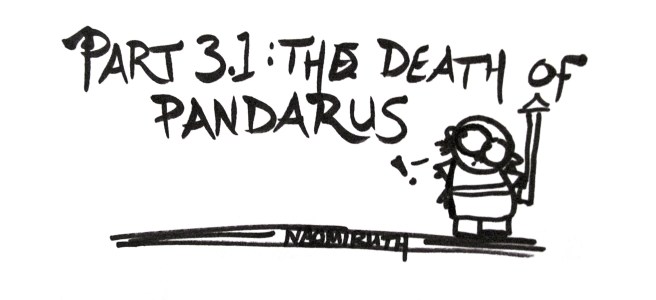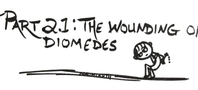 I have never done close up shots of people’s faces before, so it was kind of odd that I had two this time, but Pandarus’ has become strangely important to me. He is the one that really ends any hope of peace and he tries so hard, but the gods are against him, and his wife is going to hear the news of his death, and it’s just sad times. I do think that there is some symbolism in his death. He has his tongue sheared off and the javelin/spear enters close to his eye. He has great eyesight and used that as part of his bow and arrow skillz and because of this he boasted that he killed Diomedes – not once – but twice. It makes one wonder that if he hadn’t been as boastful would his fate have been different? It’s easy to blame Diomedes or Athena, but the Iliad includes this idea of cause and effect. There is Fate, yes, but your attitudes affect how your Fate plays out. It’s a mixture of Fate and Freewill (unlike, I would say, The Aeneid, but that’s for another day far into the future).